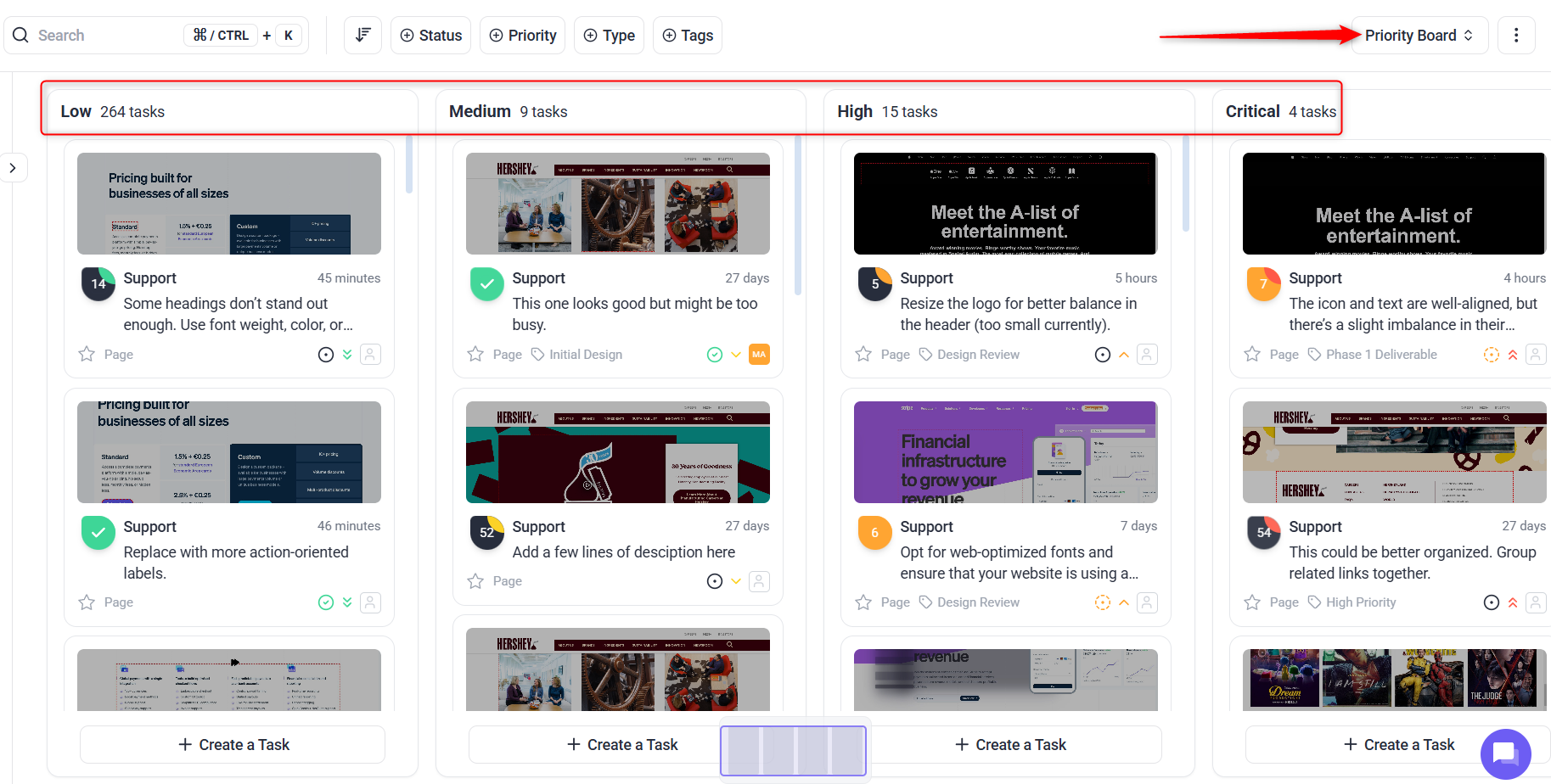 Use filters on the Inbox and Board Pages to sort tasks by urgency and status, starting with Critical items.
