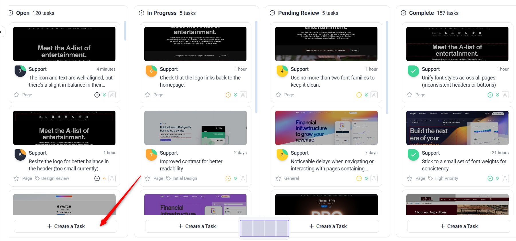 • Locate the Create Task button, always visible at the bottom of each column (e.g., Open, In Progress, Pending Review, or Completed).