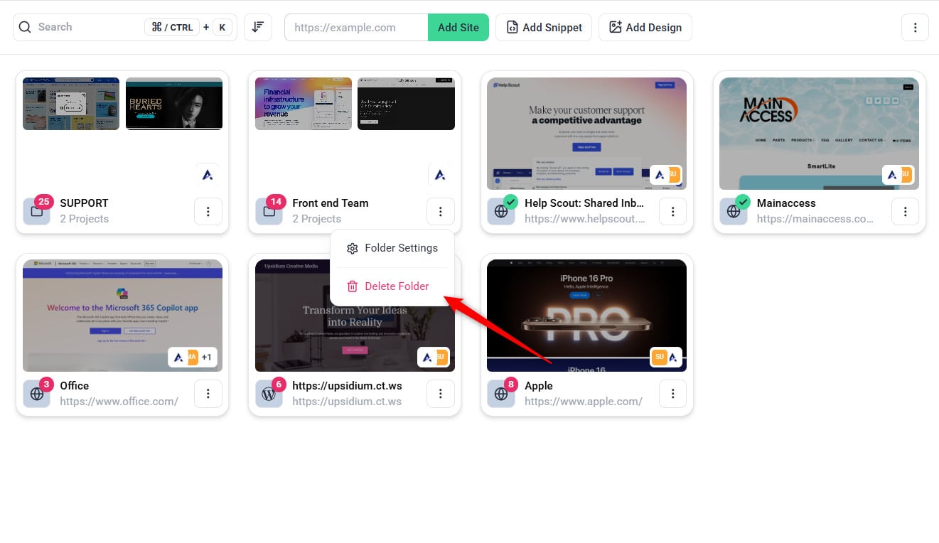 • Delete a folder via folder settings. Projects within the folder are not deleted but moved to the ungrouped view.