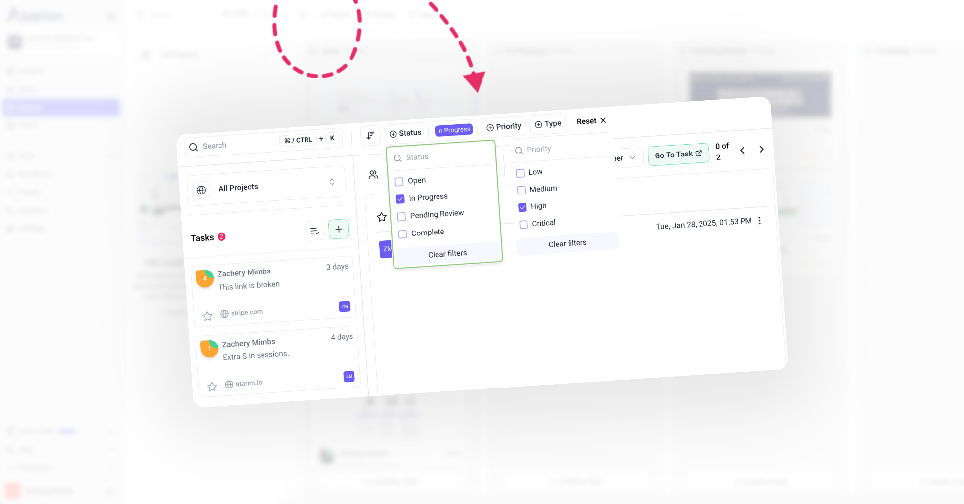 Yes, Atarim offers advanced filtering options. Navigate to the Boards or Inbox, and use the filters to sort tasks.