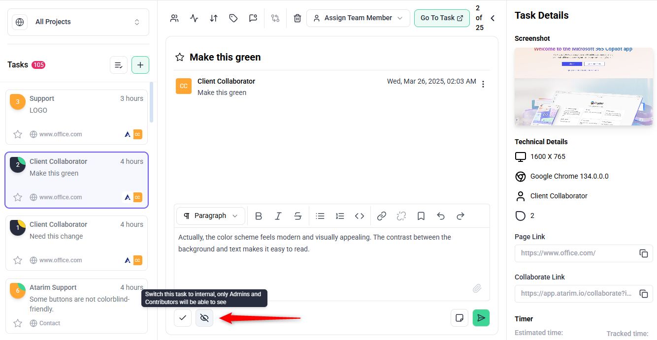 - Mark task as internal to allow only team members to view it