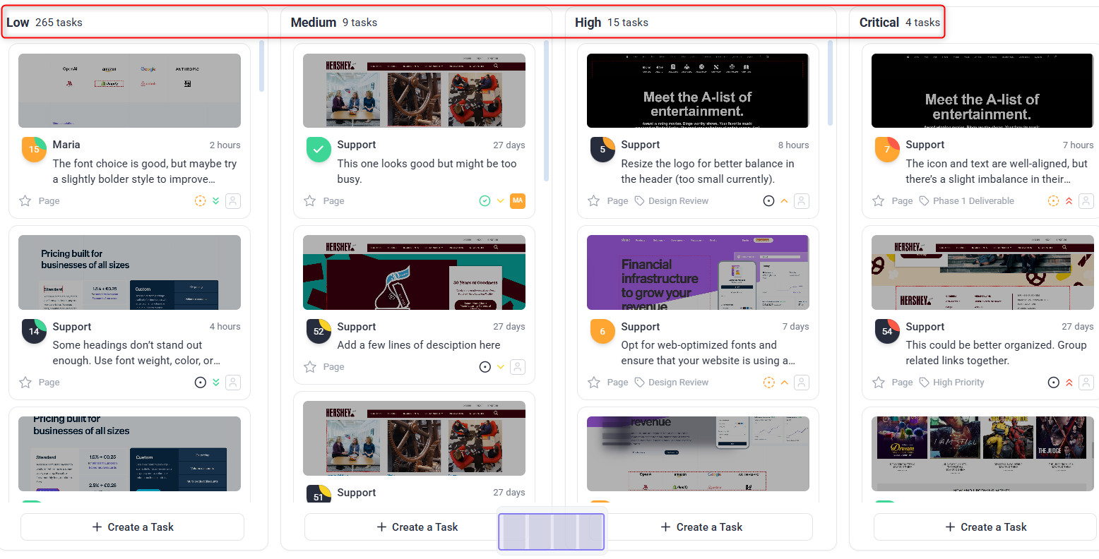 The Priority view on the Board Page lets you see tasks categorized by their level of urgency: Low, Medium, High, and Critical. This visual prioritization helps you and your team focus on what matters most.