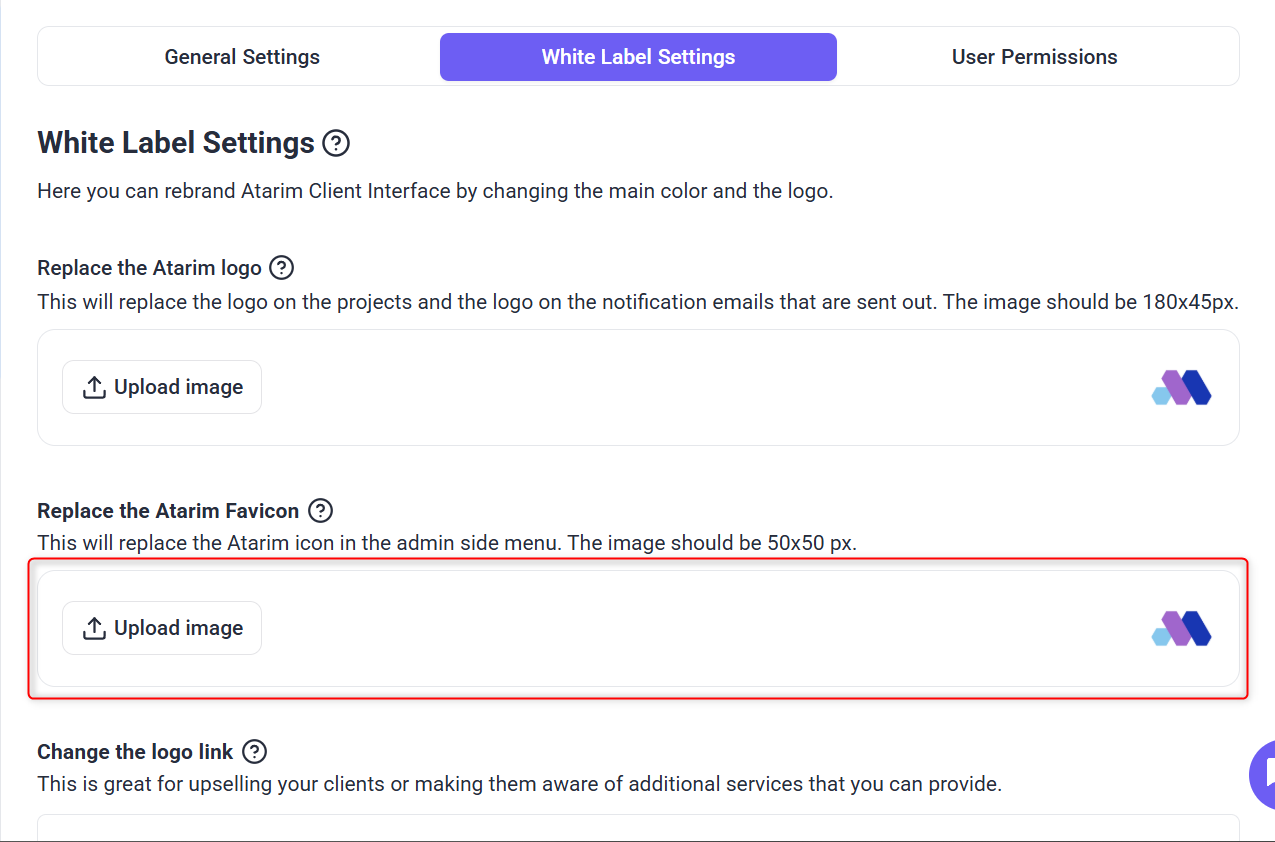 • In White Label Settings, upload a 50×50 pixel image under the “Favicon” section.