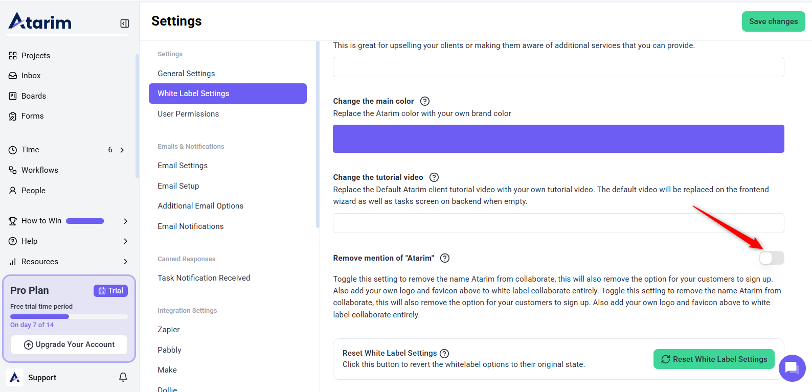• Toggle on “Remove Mentions of Atarim” in the White Label Settings.